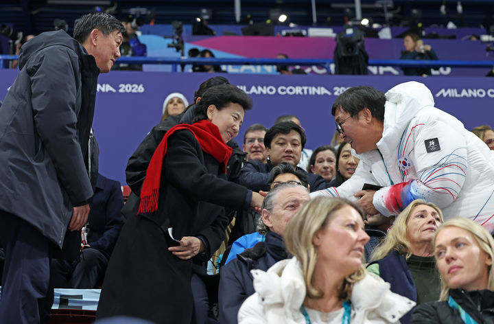 [서울=뉴시스] 최휘영 문화체육관광부 장관이 7일(현지시간) 이탈리아 밀라노 아이스스케이팅 아레나에서 열린 2026 밀라노-코르티나담페초 동계올림픽 피겨스케이팅 팀 이벤트 경기에서 선이친 중국 국무위원과 인사를 나누고 있다. (사진=문화체육관광부 제공) 2026.02.08. [email protected]