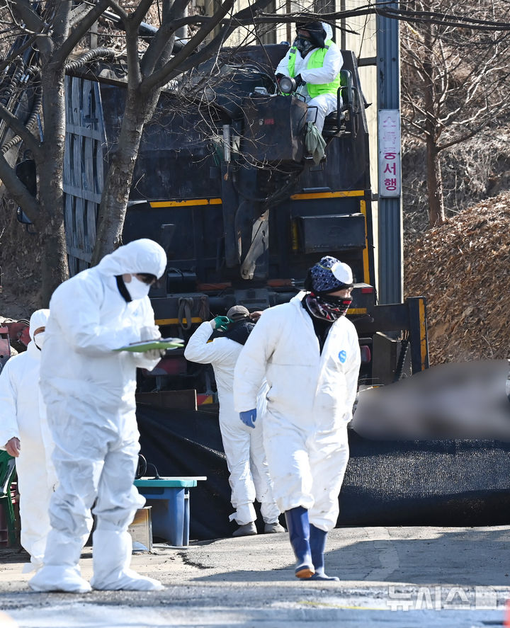 [화성=뉴시스] 김종택 기자 = 8일 아프리카돼지열병(ASF)이 발생한 경기 화성시 한 양돈농가에서 방역관계자들이 분주하게 움직이고 있다.