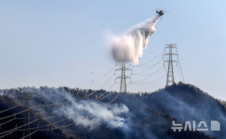 [경주=뉴시스] 이무열 기자 = 8일 오후 경북 경주시 문무대왕면 입천리에서 발생한 산불이 강풍을 타고 확산되는 가운데 산불 진화 헬기가 진화 작업을 벌이고 있다. 2026.02.08. [email protected]