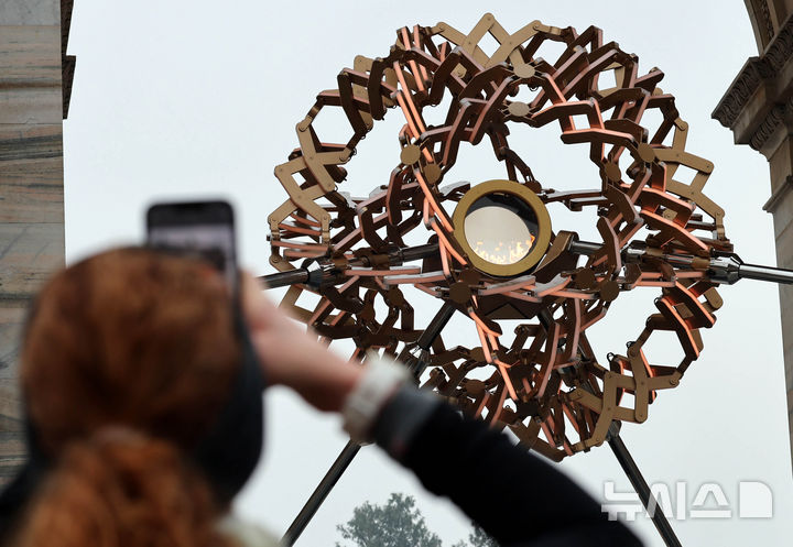 [밀라노=뉴시스] 박주성 기자 = 2026 밀라노·코르티나담페초 동계올림픽 개막 둘째날인 8일 (현지 시간) 이탈리아 밀라노 '평화의 아치'(아르코 델라 파체·Arco della Pace) 성화대에 시민들이 기념사진을 찍고 있다.2026.02.08. [email protected]