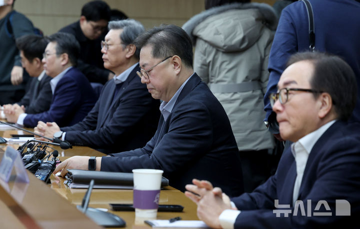 [서울=뉴시스] 김진아 기자 = 박일준 대한상공회의소 부회장이 9일 서울 종로구 한국무역보험공사에서 열린 경제단체 긴급현안 점검회의에서 사과문을 발표 후 자리하고 있다. 오른쪽 이동근 한국경영자총협회 부회장.