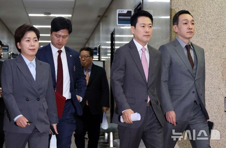 [서울=뉴시스] 조성봉 기자 = 장동혁 국민의힘 대표와 최고위원들이 9일 오전 서울 여의도 국회에서 열린 최고위원회의에 참석하고 있다. 왼쪽부터 양향자, 우재준 최고위원, 장 대표, 김민수 최고위원. 2026.02.09. [email protected]