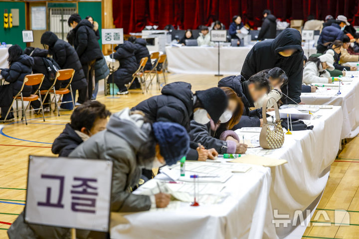 [서울=뉴시스] 정병혁 기자 = 9일 서울 동작구 서울공업고등학교 체육관을 찾은 검정고시 응시생들이 2026년도 제1회 초·중·고졸 검정고시 응시 원서를 작성 및 접수하고 있다. 2026.02.09. [email protected]