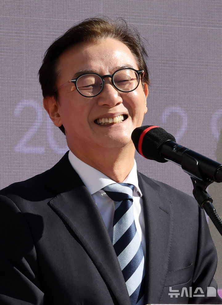 [부산=뉴시스] 하경민 기자 = 통일교 금품 수수 의혹으로 해양수산부 장관직을 사퇴한 전재수 더불어민주당 의원이 9일 부산 북구 만덕나늘목에서 열린 '만덕~센텀 고속화도로' 개통식에 참석, 축사를 하고 있다. 2026.02.09. [email protected]