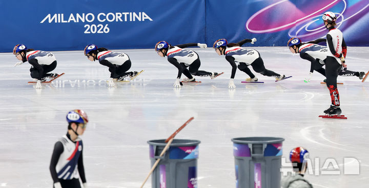 [밀라노=뉴시스] 박주성 기자 = 쇼트트랙 대한민국 대표팀 최민정(왼쪽부터), 김길리, 이소연 등이 9일(현지 시간) 이탈리아 밀라노 아이스스케이팅 아레나에서 내일 있을 경기에 대비해 훈련을 하고 있다. 2026.02.09. [email protected]