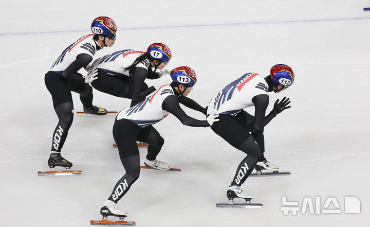 [밀라노=뉴시스] 김근수 기자 = 쇼트트랙 이준서(오른쪽부터), 임종언, 심석희, 황대헌이 9일(현지 시간) 이탈리아 밀라노 아이스 스케이팅 아레나 경기장에서 혼성 계주 훈련을 하고 있다. 2026.02.09. [email protected]
