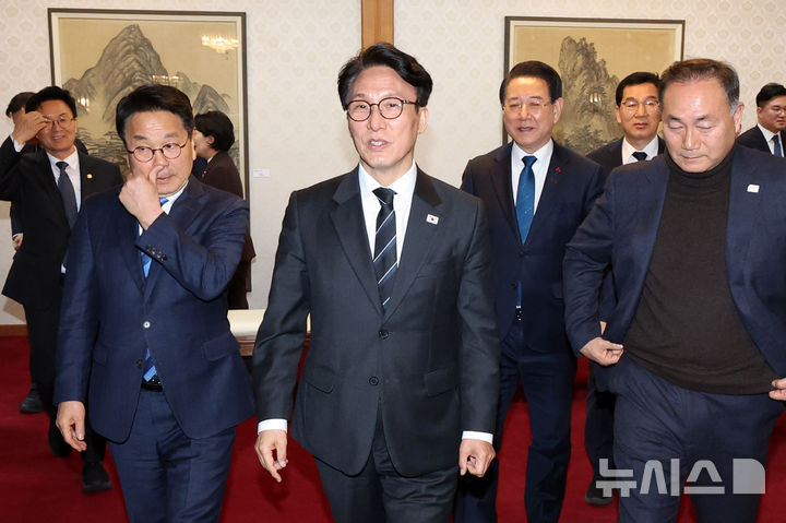 [서울=뉴시스] 조성우 기자 = 김민석(왼쪽 두 번째) 국무총리가 9일 오후 서울 종로구 총리공관에서 김영록(오른쪽 세 번째) 전남지사와 강기정(왼쪽) 광주시장, 광주·전남 지역구 의원들과 기념촬영을 마친 뒤 전남·광주 행정통합 관련 면담 장소로 향하고 있다. 2026.02.09. [email protected]