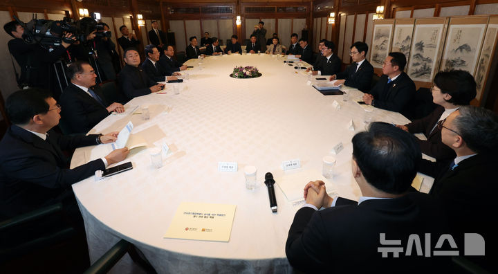 [서울=뉴시스] 조성우 기자 = 김민석 국무총리가 9일 오후 서울 종로구 총리공관에서 김영록 전남지사와 강기정 광주시장, 광주·전남 지역구 의원들과 전남·광주 행정통합 관련 면담을 하고 있다. 2026.02.09. [email protected]