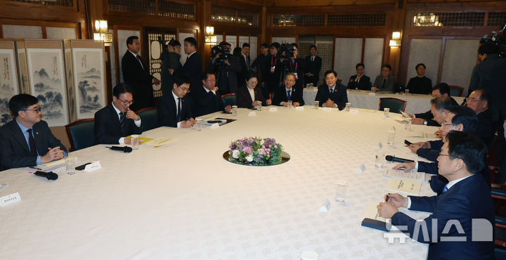 [서울=뉴시스] 조성우 기자 = 김민석(왼쪽 두 번째) 국무총리가 9일 오후 서울 종로구 총리공관에서 김영록 전남지사와 강기정 광주시장, 광주·전남 지역구 의원들과 전남·광주 행정통합 관련 면담을 하고 있다. 2026.02.09. [email protected]