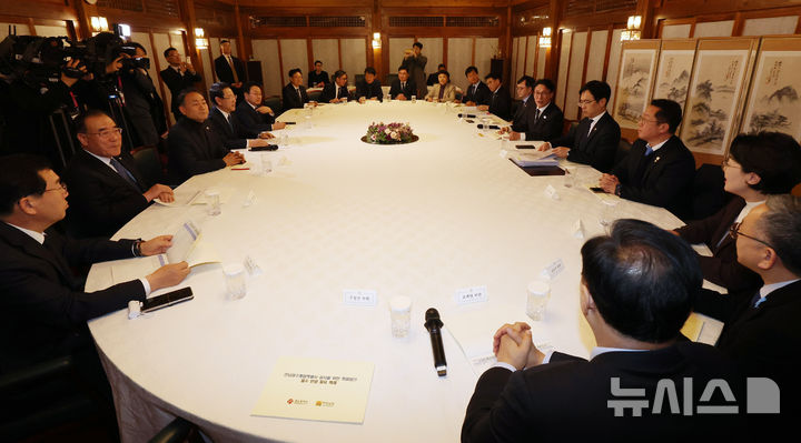 [서울=뉴시스] 조성우 기자 = 김민석 국무총리가 9일 오후 서울 종로구 총리공관에서 김영록 전남지사와 강기정 광주시장, 광주·전남 지역구 의원들과 전남·광주 행정통합 관련 면담을 하고 있다. 2026.02.09. [email protected]