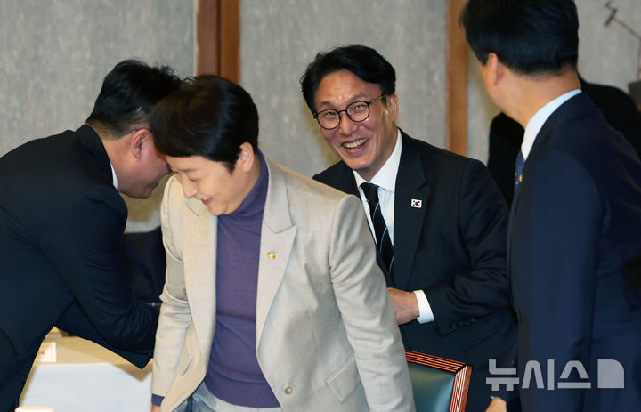 [서울=뉴시스] 조성우 기자 = 김민석(왼쪽 세 번째) 국무총리가 9일 오후 서울 종로구 총리공관에서 광주·전남 지역구 의원들과 전남·광주 행정통합 관련 면담에 앞서 인사를 나누고 있다. 2026.02.09. [email protected]