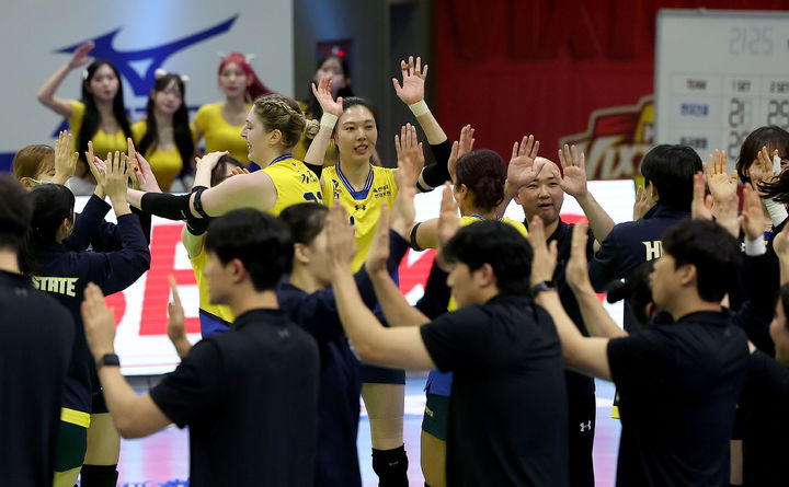 [서울=뉴시스] 조성우 기자 = 현대건설이 9일 수원실내체육관에서 열린 진에어 2025-2026 프로배구 V-리그 여자부 흥국생명과 경기에서 세트스코어 3-1로 승리를 거뒀다. 현대건설 카리 가이스버거와 양효진 등 선수들이 승리의 기쁨을 나누고 있다. (사진=현대건설 배구단 제공) 2026.02.09. [email protected] *재판매 및 DB 금지
