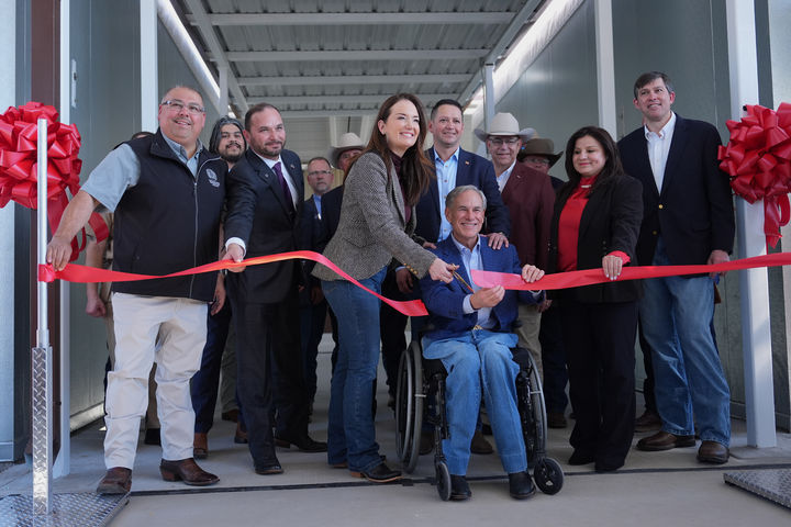 [에딘버그=AP/뉴시스] 브룩 롤린스 미국 농무부 장관과 그레그 애벗 텍사스 주지사가 9일(현지 시간) 텍사스주 에딘버그에서 열린 '신세계나사벌레'(NWS) 불임 수컷 파리 생산 시설 개소식에 참석해 리본을 자르고 있다. 애벗 주지사는 '살 파먹는 기생파리'인 NWS의 확산을 억제하고 미국 가축을 보호하기 위해 사전 재난 선언을 발령했으며 NWS 번식을 차단하는 불임 수컷 파리 생산도 추진하고 있다. 2026.02.10.
