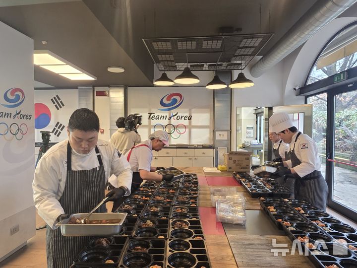 [밀라노=뉴시스] 김희준 기자 = 9일(현지 시간) 이탈리아 밀라노에서 열린 대한체육회가 운영하는 급식지원센터 공개 미디어행사가 진행되어 조리사들과 영양사들이 요리를 도시락에 담고 있다. 2026.02.09. [email protected]