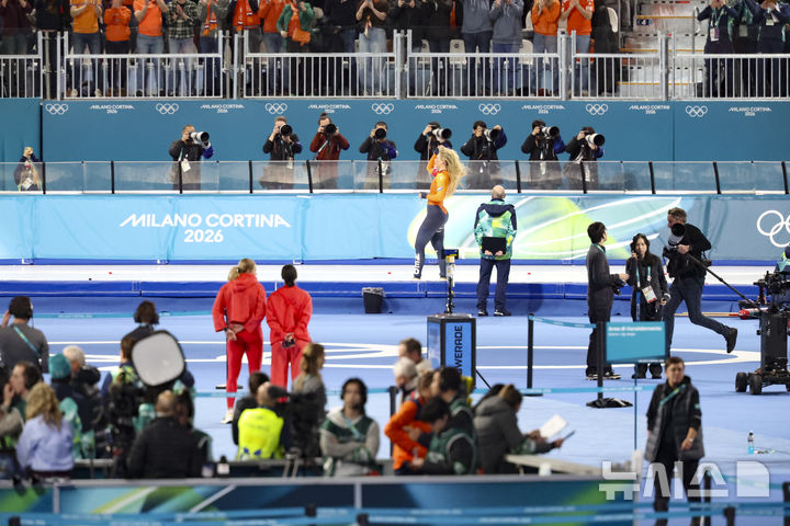 [밀라노=뉴시스] 김근수 기자 = 스피드스케이팅 여자 1000m 금메달리스트 네덜란드 유타 레이르담이 9일(현지 시간) 이탈리아 밀라노 스피드스케이팅 여자 1000m  아레나에서 열린 2026 밀라노•코르티나 담페초 동계올림픽 스피드스케이팅 여자 1000m 경기에서 금메달을 차지한 뒤 기뻐하고 있다. 2026.02.10. [email protected]