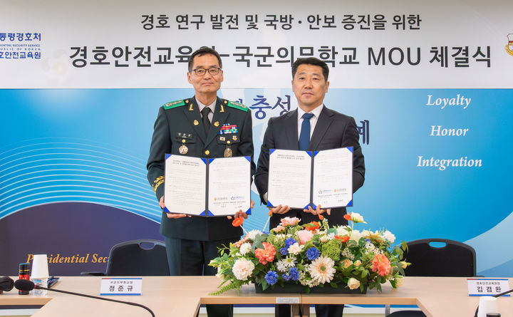 [서울=뉴시스] 최동준 기자 = 9일 서울 강서구 대통령경호처 경호안전교육원에서 열린 경호안전교육원과 국군의무학교의 업무협약 체결식에서 김겸완(오른쪽) 경호안전교육원장과 정준규 국군의무학교장이 기념촬영을 하고 있다. (사진=경호안전교육원 제공) 2026.02.10. [email protected]