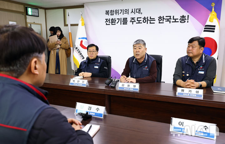 [서울=뉴시스] 최진석 기자 = 김동명(오른쪽 두번째) 한국노동조합총연맹(한국노총) 위원장이 10일 서울 여의도 한국노총 위원장실에서 열린 양대노총 위원장 신년 간담회에서 발언하고 있다. 2026.02.10. [email protected]