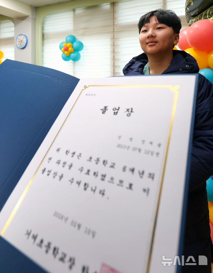 [영천=뉴시스] 이무열 기자 = 경북 영천시 금호읍 거여초등학교에서 ‘나홀로 졸업식’이 열린 10일 오전 이 학교의 유일한 올해 졸업생인 정세율 학생이 졸업장을 받고 있다. 2026.02.10. [email protected]