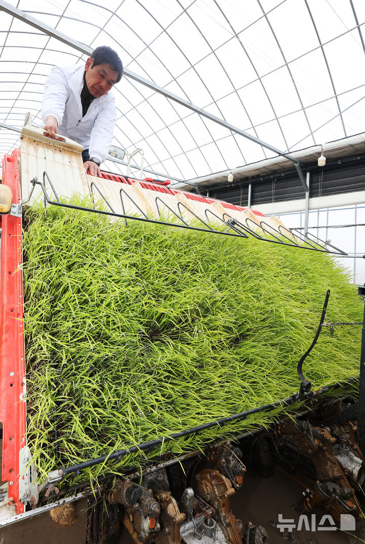 [이천=뉴시스] 김종택 기자 = 10일 경기 이천시 호법면 한 비닐하우스 논에서 열린 '임금님표 이천쌀 전국 첫 모내기' 행사에서 농민이 모판을 이앙기로 옮기고 있다.