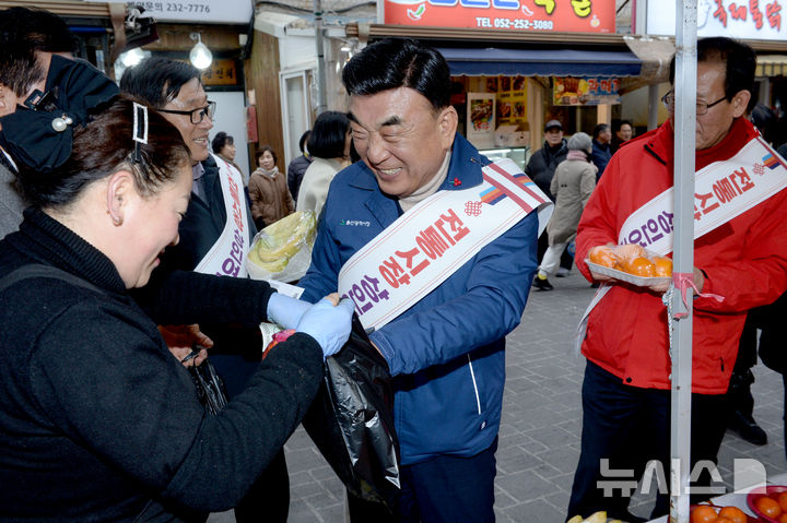 [울산=뉴시스] 배병수 기자 = 김두겸 울산시장이 설 명절을 앞둔 10일 오후 울산 동구 동울산시장에서 명절 장보기를 하고 있다. 2026.02.10. [email protected].