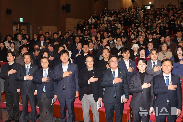 [서울=뉴시스] 김금보 기자 = 박주민 더불어민주당 의원이 10일 오후 서울 여의도 국회 의원회관에서 열린 ‘정치는 도시를 바꾼다‘ 자신의 출판기념회에서 국민의례를 하고 있다. 2026.02.10. [email protected]