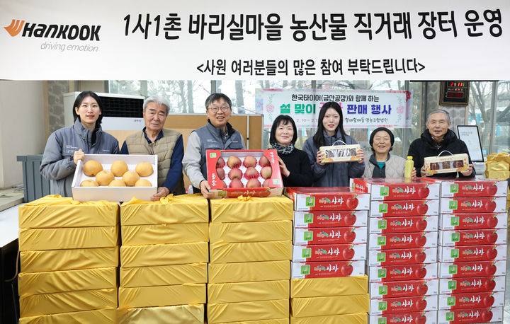 [금산=뉴시스] 김양수 기자 = 11일 한국타이어앤테크놀로지㈜ 금산공장에서 '설 맞이 농∙특산물 직거래장터'가 열리고 있다. 이 곳에선 한국타이어의 1사1촌 마을인 제원면 바리실마을서 생산되는 청정 농∙특산물이 12일까지 저렴한 가격에 판매된다.(사진=한국타이어 제공).2026..2.11. [email protected]