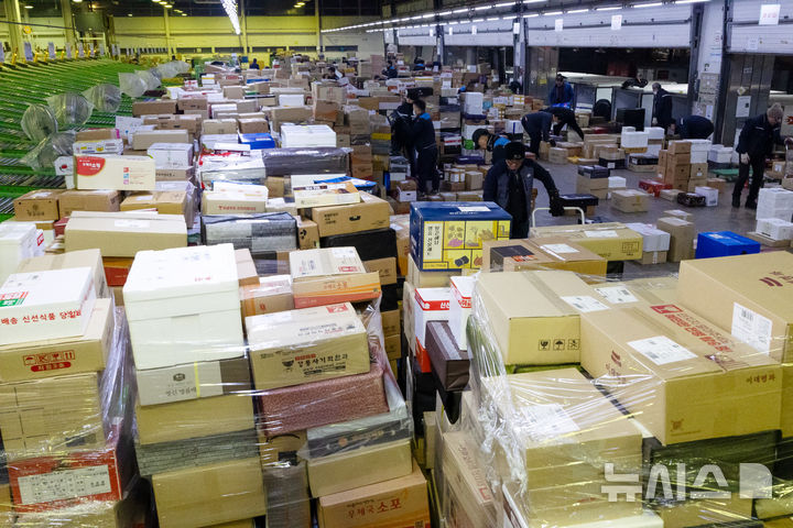 [서울=뉴시스] 김명년 기자 = 설 연휴를 앞둔 11일 오전 서울 광진구 동서울우편물류센터에서 직원들이 택배 분류 작업을 하고 있다. 우정사업본부는 오는 20일까지 '설 명절 우편물 특별소통기간'으로 정하고 비상근무체계에 돌입한다. 2026.02.11. [email protected]