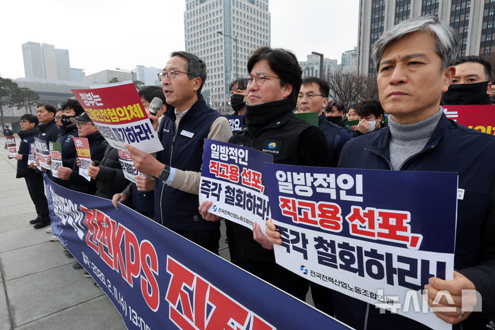 [서울=뉴시스] 배훈식 기자 = 전국전력산업노동조합연맹 조합원들이 11일 오후 서울 종로구 정부서울청상 앞에서 일방적인 한전KPS 직접고용 강행 반대 기자회견을 하고 있다.