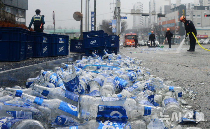 [전주=뉴시스] 김얼 기자 = 11일 전북 전주시 덕진구 동부대로에 맥주 운반차량에서 쏟아져 내린 맥주병들이 깨진 채 도로에 널브러져 있어 소방관들이 현장을 정리하고 있다. 2026.02.11. [email protected]