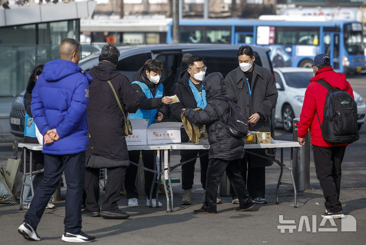 [서울=뉴시스] 정병혁 기자 = 염영남 뉴시스 대표이사 사장과 임직원들로 구성된 뉴시스 봉사단이 11일 서울 용산구 서울역 광장에서 노숙인 설맞이 떡 나눔 지원 봉사활동을 하고 있다. 2026.02.11. [email protected]