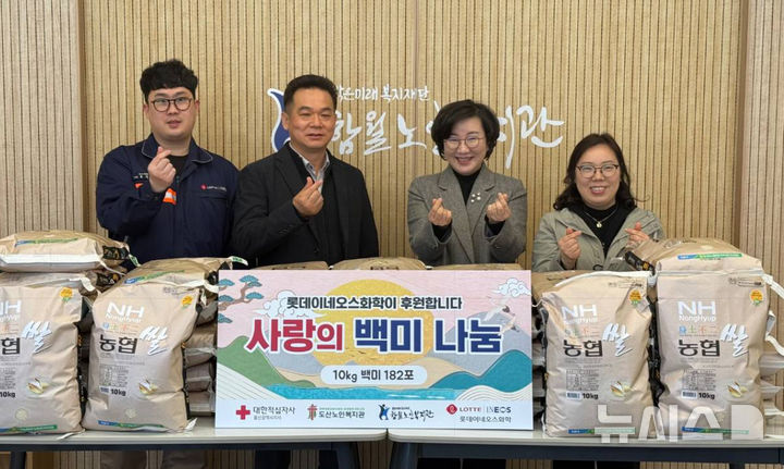 [울산=뉴시스] 롯데이네오스화학이 11일 대한적십자사 울산지사와 함께 도산노인복지관과 함월노인복지관을 방문해 ‘사랑의 백미 182포 나눔’ 전달식을 가지고 있다.(사진=롯데이네오스화학 제공). 2026.02.11. [email protected].