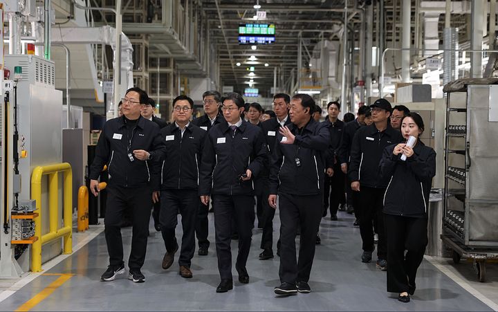[서울=뉴시스] 황준선 기자 = 이억원 금융위원장이 11일 오전 광주광역시 서구 기아오토랜드 광주1공장을 방문해 생산라인을 시찰하고 있다. (사진=금융위원회 제공) 2026.02.11. [email protected]