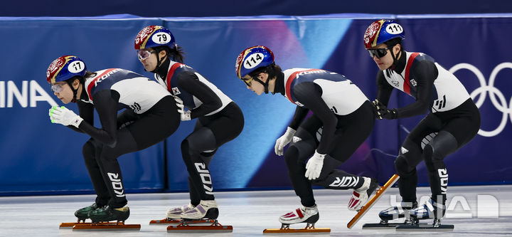 [밀라노=뉴시스] 김근수 기자 = 쇼트트랙 심석희(왼쪽부터)과 노도희, 신동민, 이정민이 11일(현지 시간) 이탈리아 밀라노 아이스스케이팅 아레나에서 계주 훈련을 하고 있다. 2026.02.11. [email protected]