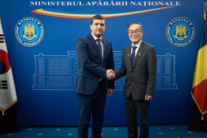 [서울=뉴시스] 황준선 기자 = 이용철(오른쪽) 방위사업청장과 라두 디넬 미루처(Radu-Dinel Miru) 루마니어 국방장관이 10일(현지시간) 루마니아 국방부에서 면담을 마친 뒤 기념촬영을 하고 있다. (사진=방위사업청 제공) 2026.02.11. [email protected] *재판매 및 DB 금지
