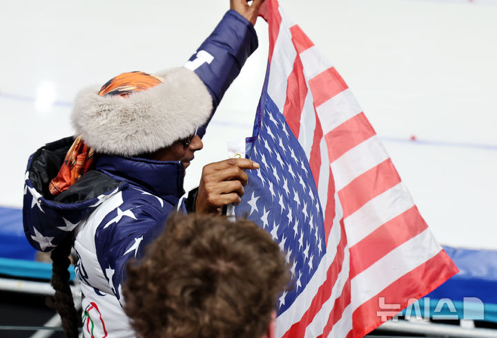 [밀라노=뉴시스] 박주성 기자 = 미국의 힙합 스타 스눕독이 11일 (현지 시간) 이탈리아 밀라노 스피드스케이팅 아레나에서 열린 2026 밀라노코르티나 담페초 동계올림픽 스피드스케이팅 남자 1000m 경기에서 미국의 조던 스톨츠 선수가 금메달을 따자 성조기를 들고 환호하고 있다. 2026.02.11. [email protected]