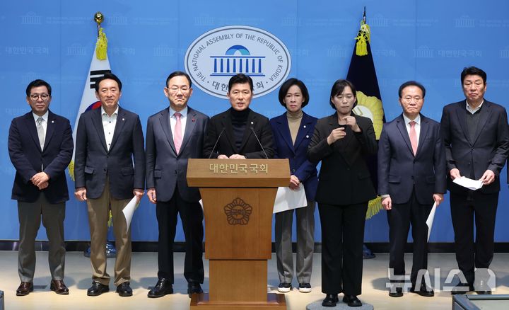 [서울=뉴시스] 조성봉 기자= 구자근 국민의힘 의원과 대구경북 의원들이 12일 오전 서울 여의도 국회 소통관에서 대구경북 통합관련 기자회견을 열고 '지방 재정 자율성 확보와 방안 마련' 등을 촉구하고 있다. 2026.02.12. [email protected]