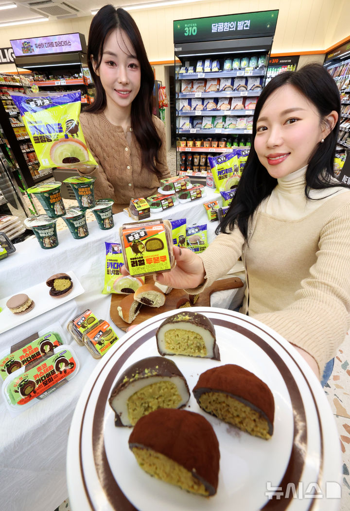 [서울=뉴시스] 조성우 기자 = 12일 오전 서울 성동구 이마트24 본점에서 모델들이 '두바이 스타일' 디저트 신제품 두바이카다이프크림빵과 두바이쫀득쿠키, 두바이카다이프쫀득모찌빵, 두바이카다이프마카롱 등 10종을 선보이고 있다. 2026.02.12. [email protected]