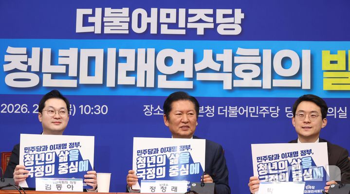 [서울=뉴시스] 조성봉 기자 = 정청래 더불어민주당 대표와 김동아 청년미래연석회의 의장, 박지원(오른쪽) 최고위원이 12일 오전 서울 여의도 국회에서 열린 민주당 제6기 청년미래연석회의 발대식에서 손피켓을 들고 구호를 외치고 있다. 2026.02.12. [email protected]
