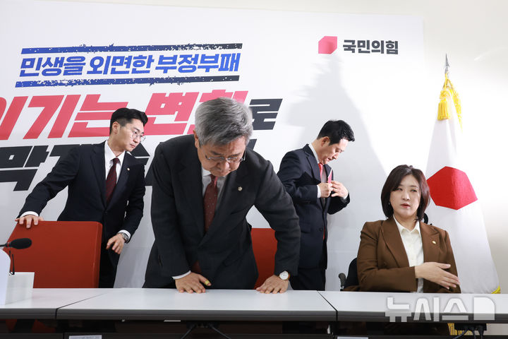 [서울=뉴시스] 고승민 기자 = 장동혁 국민의힘 대표가 12일 서울 여의도 국회에서 청와대 오찬 불참 기자회견 후 자리를 나서고 있다. 2026.02.12. [email protected]