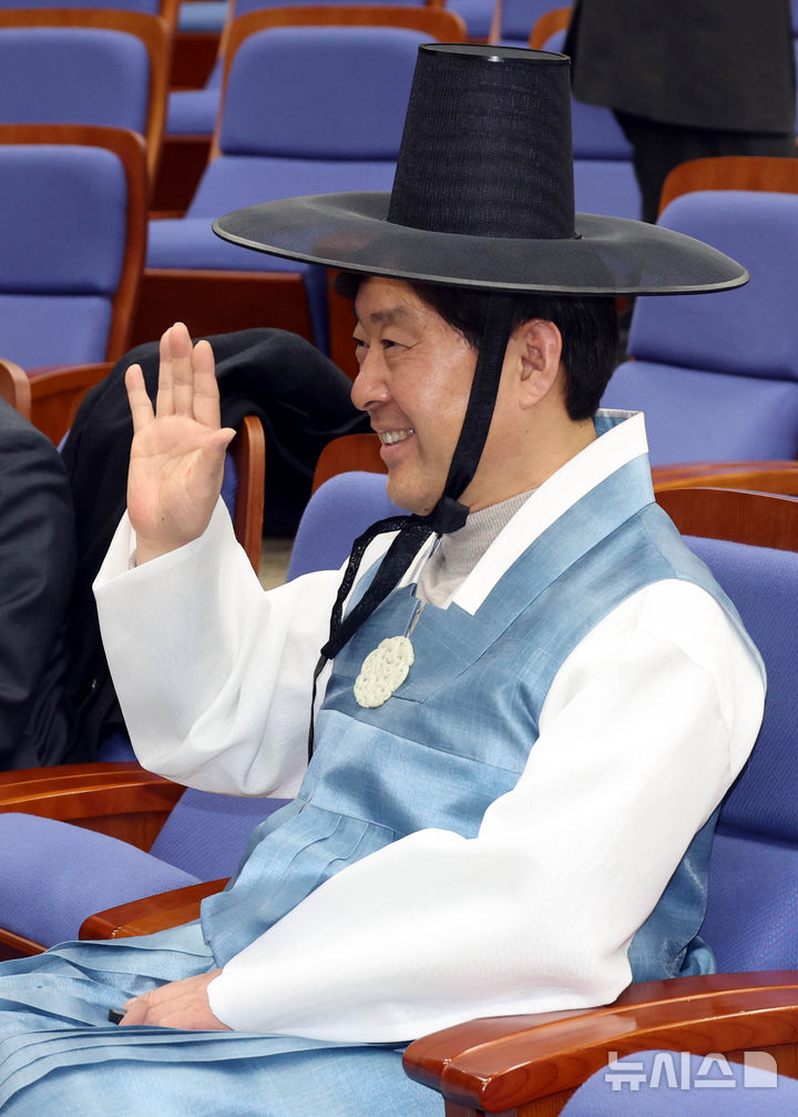 [서울=뉴시스] 조성봉 기자 = 한복을 입은 황명선 더불어민주당 최고위원이 12일 오후 서울 여의도 국회에서 열린 의원총회에서 취재진을 향해 손 인사를 하고 있다. 2026.02.12. [email protected]