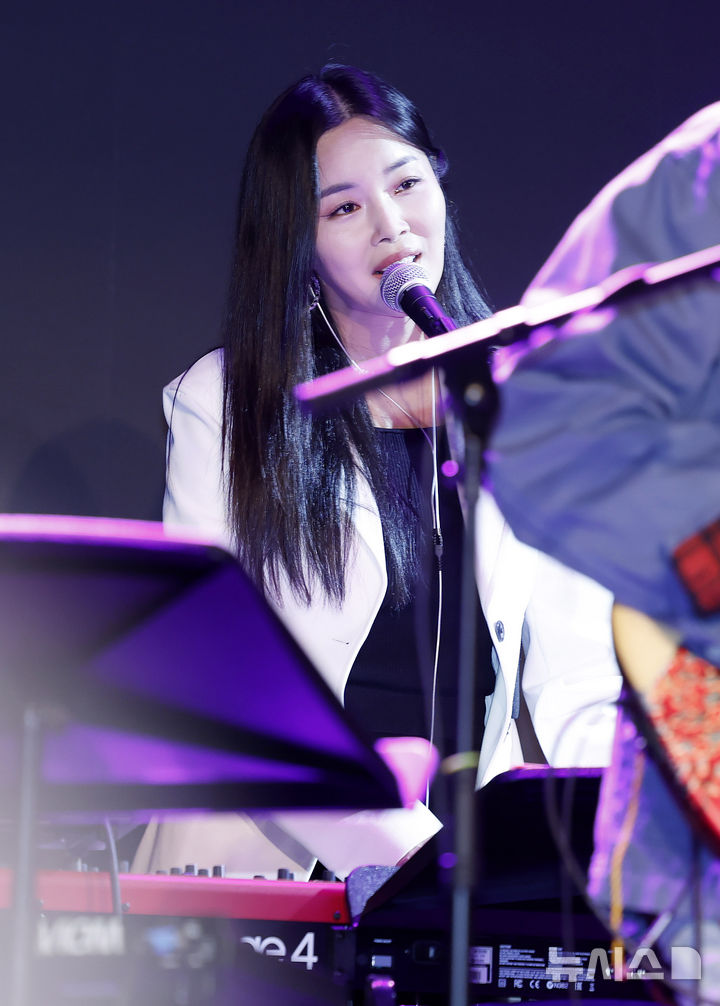 [서울=뉴시스] 김혜진 기자 = 아묻따밴드 조정민이 12일 오후 서울 종로구 SA홀에서 열린 첫 디지털 싱글 '알고 있잖아' 발매 기념 쇼케이스에서 무대를 선보이고 있다.  2026.02.12. [email protected]