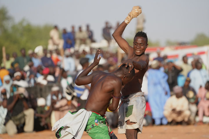[케비=AP/뉴시스] 12일(현지 시간) 나이지리아 북서부 케비에서 전통 방식의 복싱 경기가 열려 참가 선수들이 싸우고 있다. 나이지리아 전통 복싱은 글러브가 아닌 밧줄을 한 손에 동여매고 상대를 공격하며 밧줄을 매지 않은 손은 방어와 잡기에 이용된다. 2026.02.13.