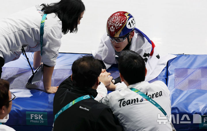 [밀라노=뉴시스] 김근수 기자 = 대한민국 쇼트트랙 임종언이 12일(현지 시간) 이탈리아 밀라노 아이스스케이팅 아레나에서 열린 2026 밀라노·코르티나 담페초 동계올림픽 쇼트트랙 남자 1000m에서 동메달을 차지한 뒤 코치진들과 기뻐하고 있다. 2026.02.13. [email protected]