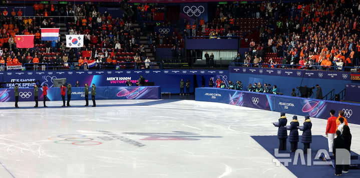 [밀라노=뉴시스] 박주성 기자 = 12일(현지 시간) 이탈리아 밀라노 아이스스케이팅 아레나에서 2026 밀라노·코르티나 담페초 동계올림픽 쇼트트랙 남자 1000m 시상식이 진행되고 있다. 이날 쇼트트랙 임종헌 선수는 3위로 동메달을 목에 걸었다. 2026.02.13. [email protected]