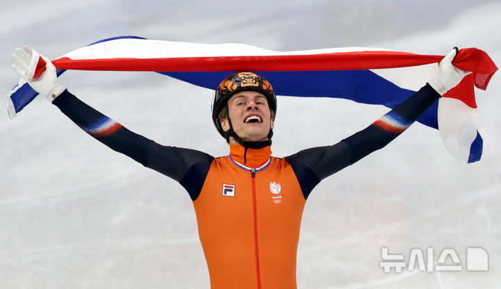 [밀라노=뉴시스] 박주성 기자 = 12일(현지 시간) 이탈리아 밀라노 아이스스케이팅 아레나에서 열린 2026 밀라노·코르티나 담페초 동계올림픽 쇼트트랙 남자 1000m 결승에서 네덜란드 옌스 판트 바우트가 금메달을 차지한 후 국기를 들고 기뻐하고 있다. 2026.02.13. [email protected]