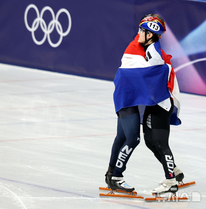 [밀라노=뉴시스] 박주성 기자 = 12일(현지 시간) 이탈리아 밀라노 아이스스케이팅 아레나에서 열린 2026 밀라노·코르티나 담페초 동계올림픽 쇼트트랙 남자 1000m 결승에서 동메달을 차지한 임종언이 금메달을 차지한 네덜란드 옌스 판트 바우트와 포옹하고 있다. 2026.02.13. [email protected]