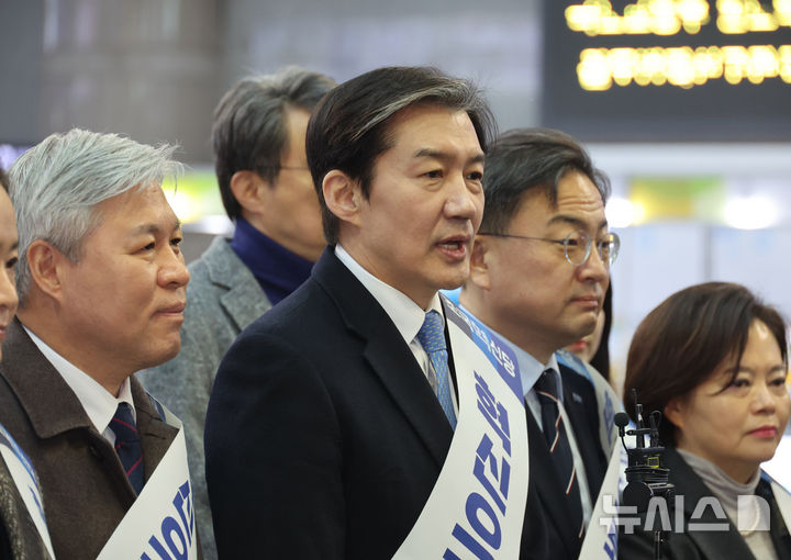 [서울=뉴시스] 김금보 기자 = 조국 조국혁신당 대표가 13일 오전 서울 용산구 용산역에서 설 명절 귀성객에게 전하는 인사말을 하고 있다. 2026.02.13. [email protected]