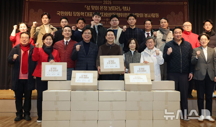 [서울=뉴시스] 권창회 기자 = 장동혁 국민의힘 대표를 비롯한 약자와의동행위원회 소속 의원들이 13일 오전 서울 중구 중림종합사회복지관에서 설맞이 봉사활동을 하기 위해 방문해 기념촬영을 하고 있다. (공동취재) 2026.02.13. [email protected]