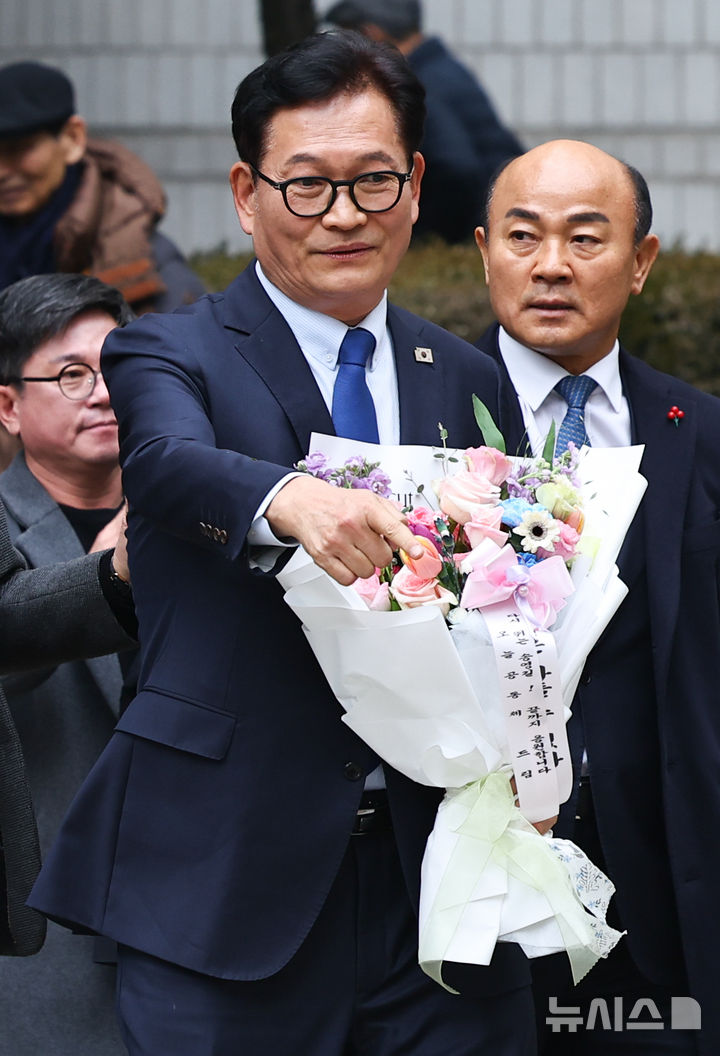 [서울=뉴시스] 최진석 기자 = 송영길 소나무당 대표가 13일 서울 서초구 서울고등법원에서 열린 '더불어민주당 전당대회 돈봉투' 의혹 관련 2심에서 무죄를 선고 받은 뒤 꽃다발을 들고 이동하고 있다. 2심은 1심 판결을 파기하고, 송 대표에게 제기된 혐의 전부에 대해 무죄를 선고했다. 2026.02.13. [email protected]