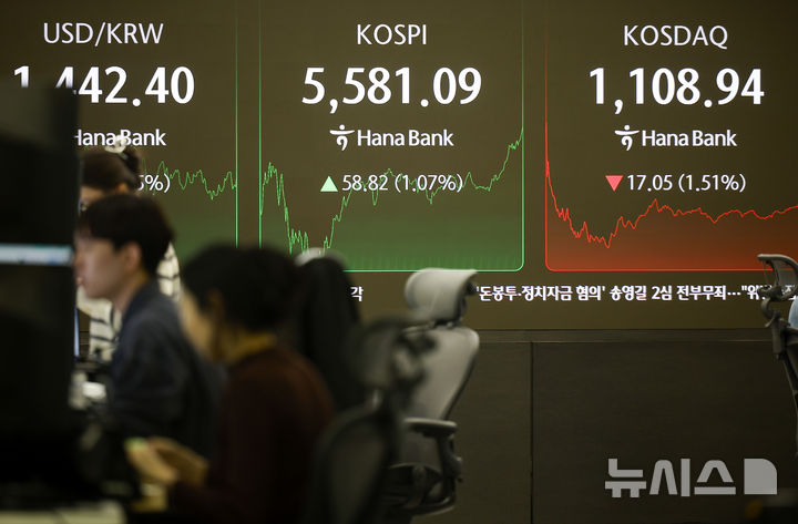 [서울=뉴시스] 정병혁 기자 = 코스피가 장중 5580선을 돌파한 가운데 13일 서울 중구 하나은행 딜링룸 전광판에 시황 정보가 나타나 있다. 2026.02.13. [email protected]